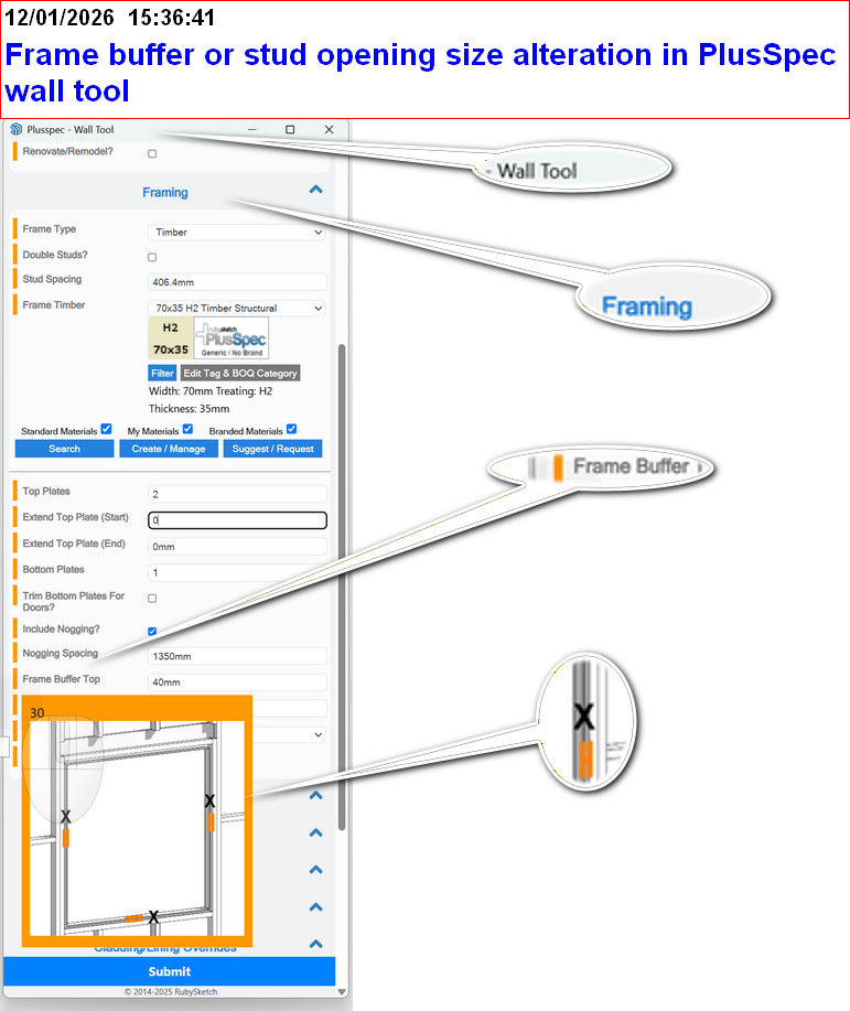 The size of the frame opening is still done in the same way, which is the width & height entered plus the value set in the Frame Buffer Top/Other fields located in the Framing section of the Wall Tool (e.g. 820mm door width + 30mm frame buffer = 820mm + 2 x 30mm = 880mm total opening width in frame).