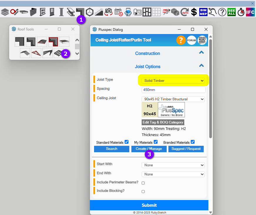 Ceiling Joist Tool & create a metal batten material as a joist (I’d do it under the Solid Timber joist type).