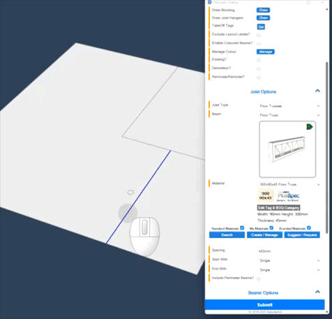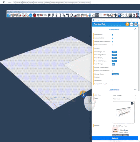 Tip: it might be easier to serpate the face you draw the floor joist on as moving a joist that is working to maximum floor span will increase and reduce the span either side, where as dividing the face at the edge of the floor waste will enable you to use “Start with or End with None” on multiple faces also drawing the floor waste in the floor will cut the flooring to make it easier.