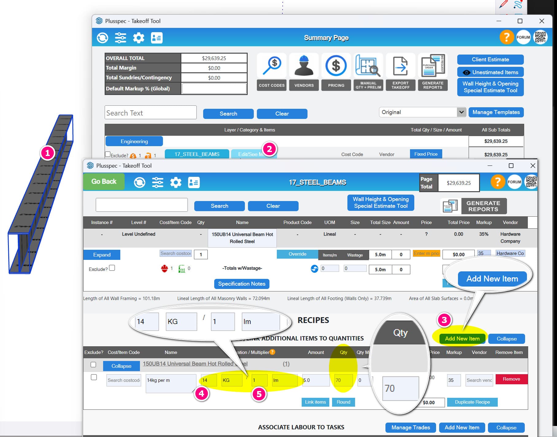 Is there a way of quantifying structural steel by weight? I use a plugin called Deca Steel, which helps create rough structural frames. I want to gather this information and bring it into Plusspec, then use it for pricing. Pricing using tonnage, so I would need the weights of all the members.
